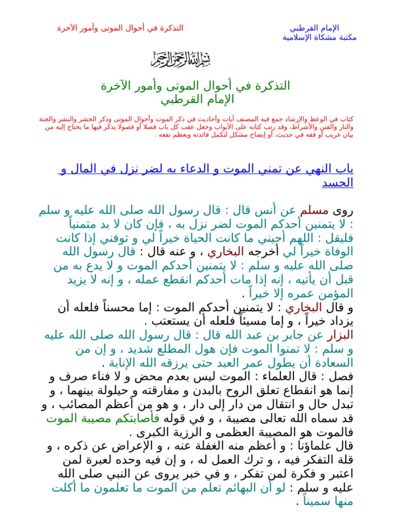 ملف التذكرة بأحوال الموتى وأمور الآخرة خ Pdf ويكي مصدر