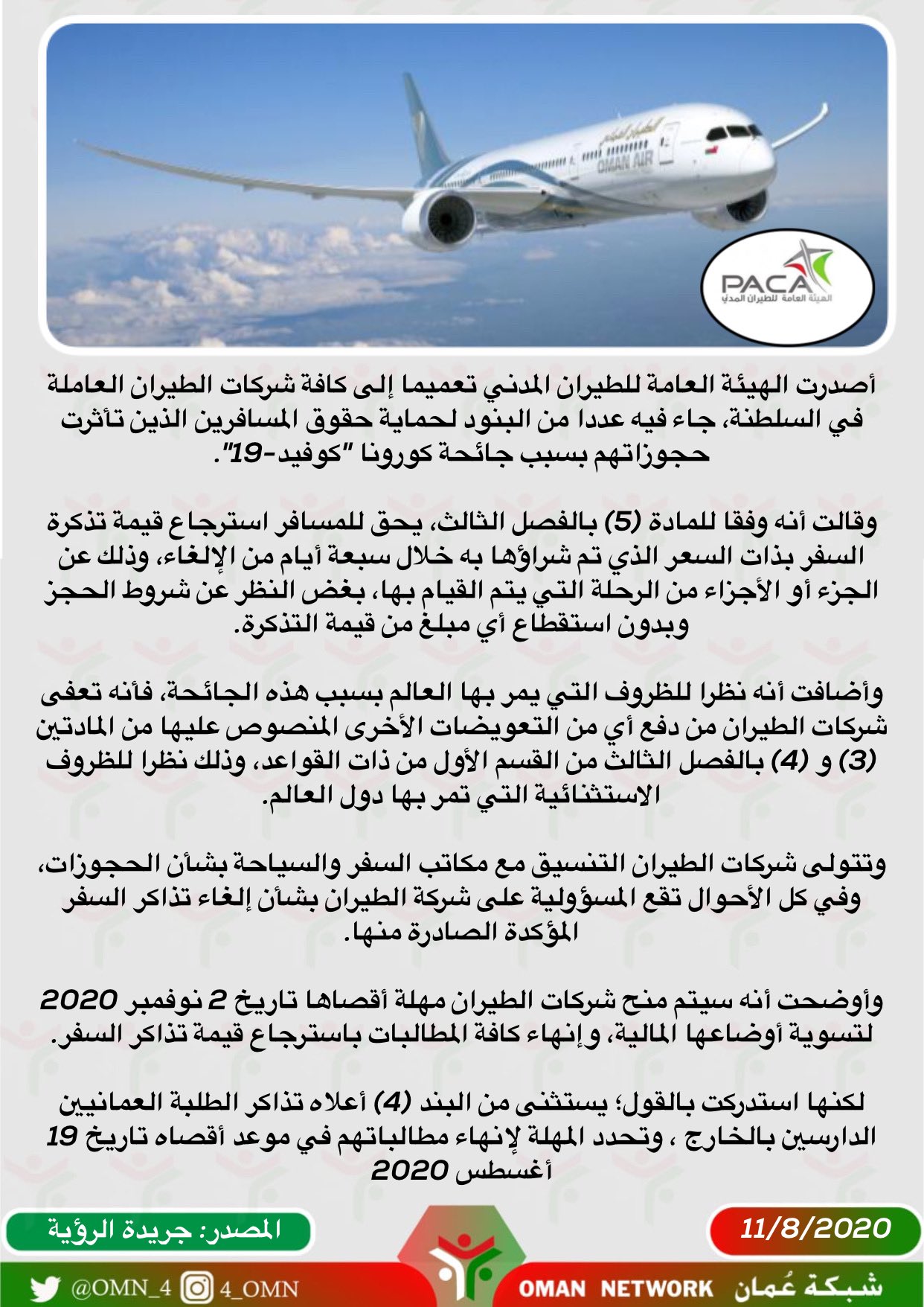 O Xrhsths شبكة ع مان Oman Network Sto Twitter الطيران المدني تصدر تعميما لشركات الطيران في السلطنة يحق للمسافر استرجاع قمية تذكرة السفر بذات السعر الذي تم شراؤها خلال 7