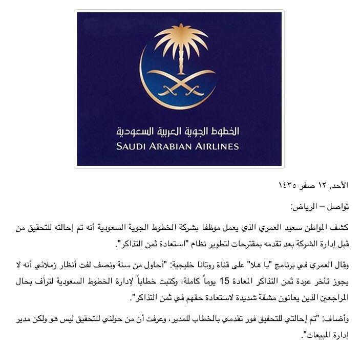 أخبار السعودية A Twitter الخطوط السعودية تحقق مع أحد موظفيها بسبب تعاطفه مع المراجعين وتقديمه مقترحا لتطوير نظام استعادة ثمن التذاكر Http T Co Fon650phsz
