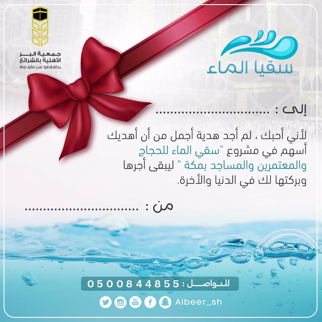 جمعية البر بالشرائع بمكة المكرمة Sur Twitter اهدي من تحب أسهم في مشروع سقيا الماء واحصل على بطاقة إهداء فاخرة بإسم من تحب ليكون لك بذلك حسنات وأجور لاينقطع فضلها وأجرها حتى